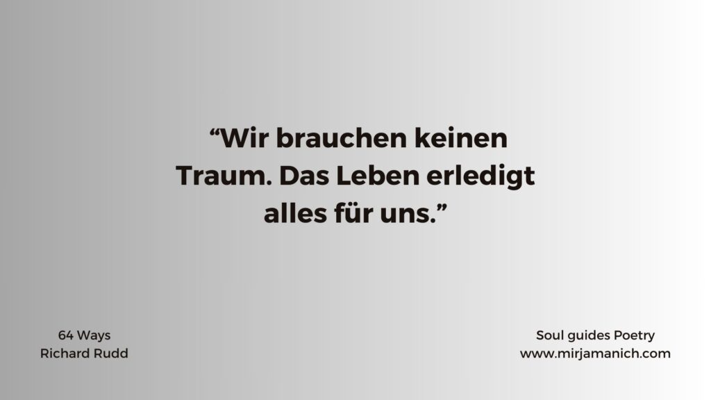 Im vollen Vertrauen in den Plan des Lebens, braucht er selber nicht mal einen Traum zu verfolgen, denn das Universum sorgt für alle und alles. Er hat sich sein Leben so aufgebaut, dass es genügend Zeit und Raum gibt zum Verweilen, zum Freundetreffen, zum Bedientwerden, für Gemeinschaft und Freude.