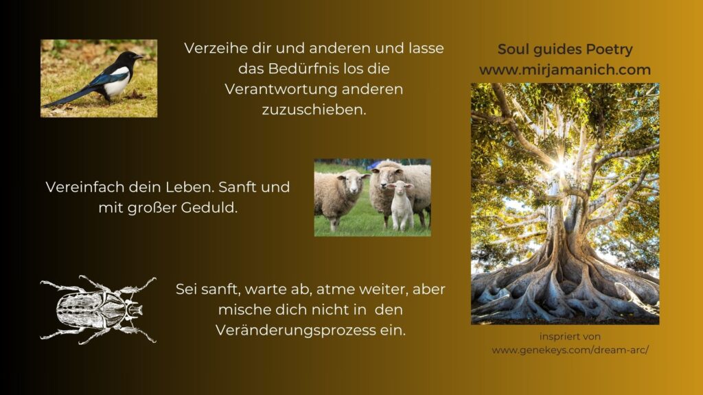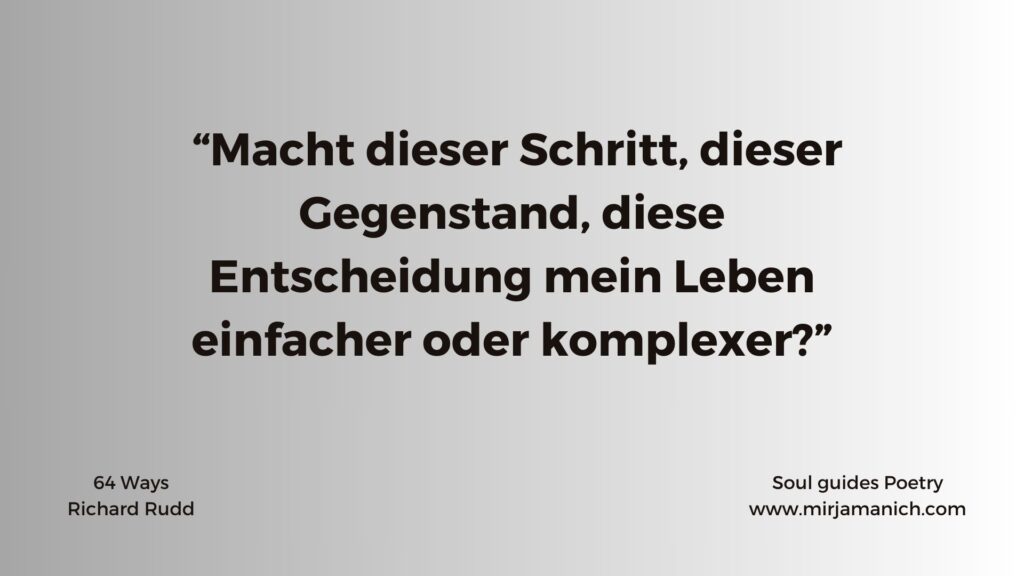 Wir filtern die Quintessenz heraus – Pausen, Stille und Liebe hält Einzug. Wir haben den Weg des Suchens und sehnens verlassen und gehen unseren Lebenspfad in völliger Hingaben, im Vertrauen zu uns selber, sowie im Wissen, dass sich der Pfad mit jeden Schritt neu ausjustiert.