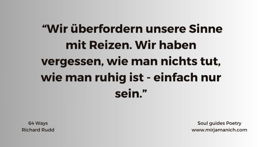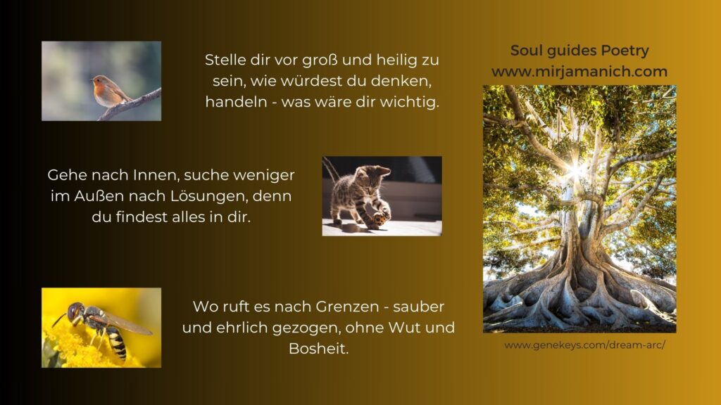 Du hast zurück zur Natur gefunden, nimmst regelmäßige Entsapnnungspausen und verbringst diese sehr viel draußen. Dadurch hast du gelernt dich abzugrenzen, Nein zu sagen und deine Zeit als Ressource zu sehen. Dadurch wirst du eine große Inspirationsquelle für deine Mitmenschen.