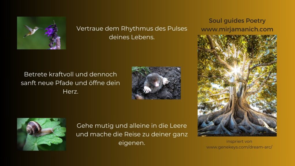 Sie setzt Dinge in die Tat um, fließt mit dem Fluss der Kreativität durch ihr Leben, hat keine Angst neue Dinge auszuprobieren oder sich neu zu definieren. Sie gibt sich dem Leben hin und ruht sich nicht aus, in der Vorstellung wer oder was sie sein soll sondern erfindet sich ständig neu. Sie erschafft Pfade, wo noch kein Mensch gegangen ist und lässt sämtliche Nachahmungsversuche los.